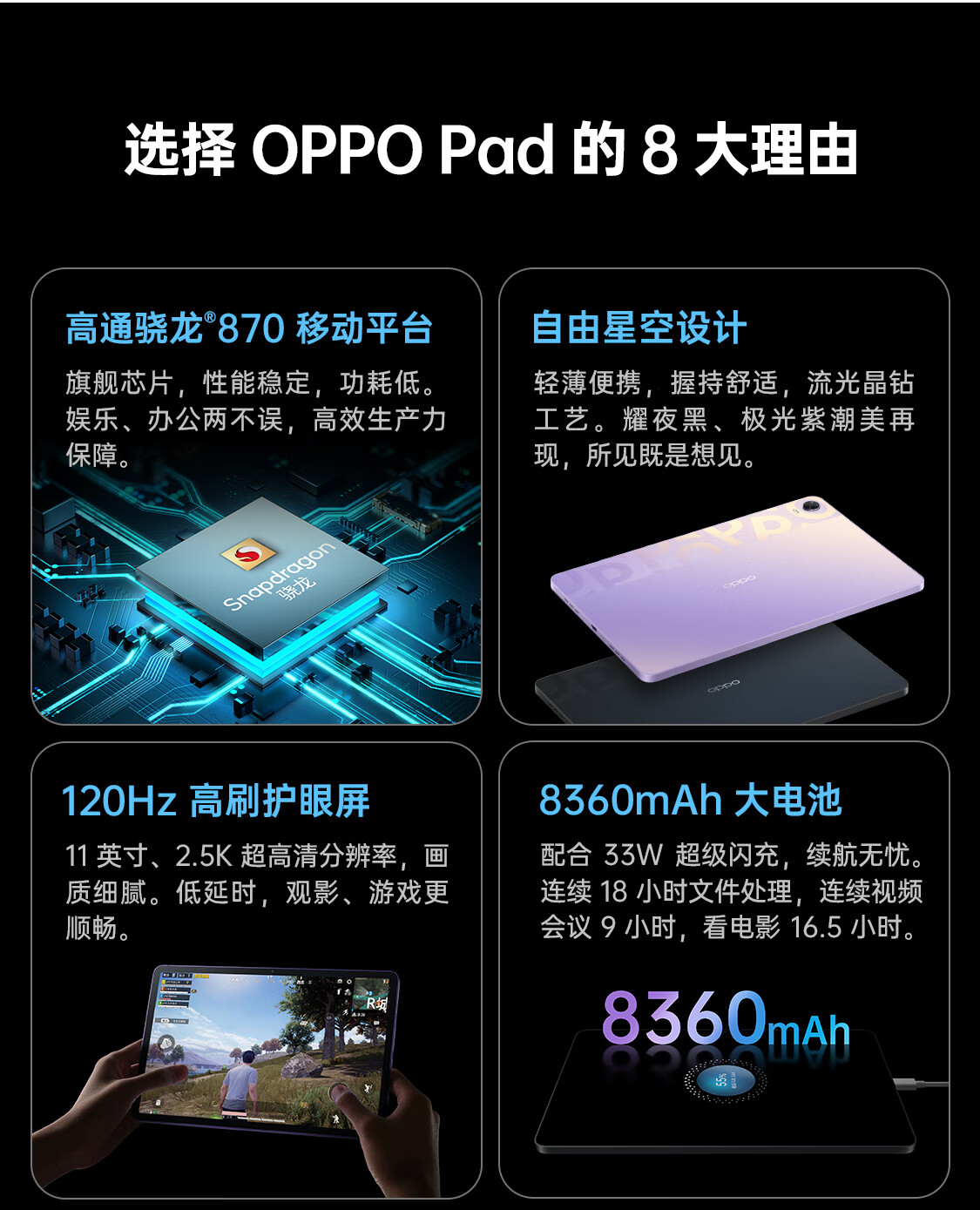 OPPO Pad平板 11英寸 2.5K 120Hz高刷护眼屏 骁龙870 8GB+256GB 耀夜黑 娱乐游戏 学生学习教育 办公平板电脑