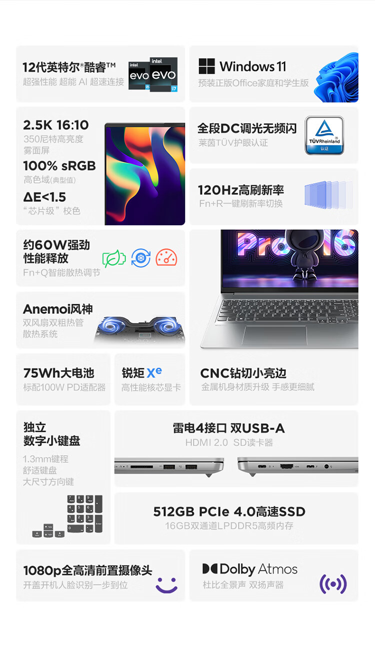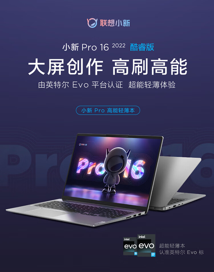 联想笔记本电脑小新Pro16轻薄本 英特尔酷睿i5 16英寸超能本(12核标压i5 16G 512G 2.5K高刷屏)银 商务办公